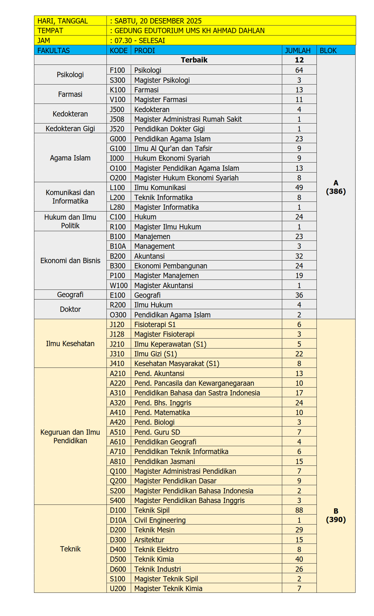 - Gladi bersih wisuda dilaksanakan pada hari Jumat, 19 Desember 2025; Jam 13.00 di Gedung Edutorium UMS KH Ahmad Dahlan.