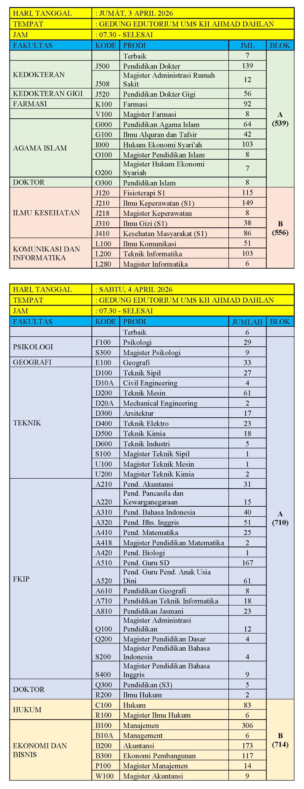 Jadwal pelaksanaan dan pembagian blok kursi prosesi wisuda sebagai berikut:
